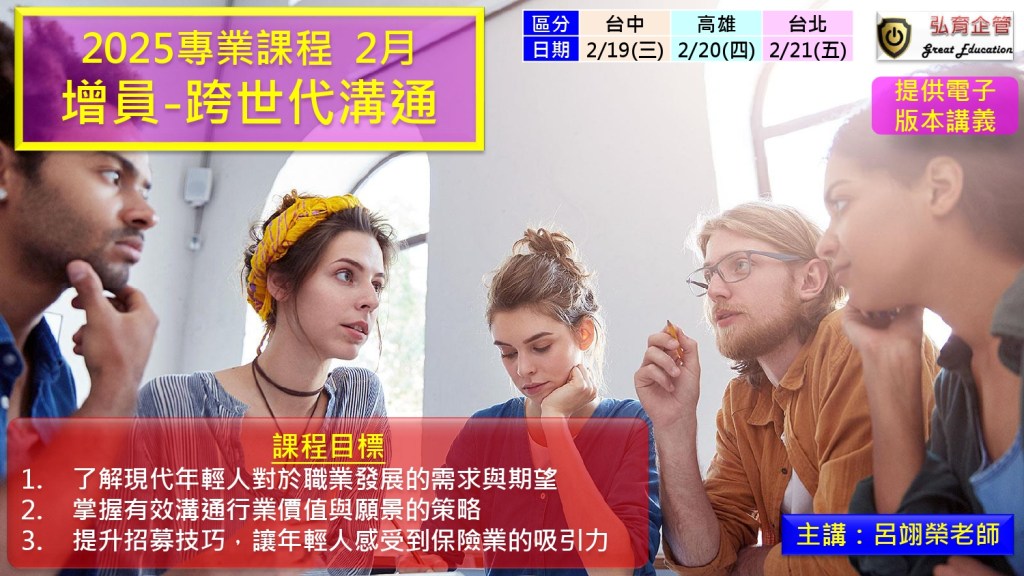 這個課程將幫助主管不僅理解年輕世代的職業價值觀,還能有效地溝通保險業的長遠願景,並設計適合年輕人的招募策略。