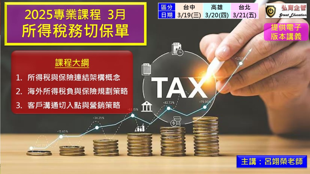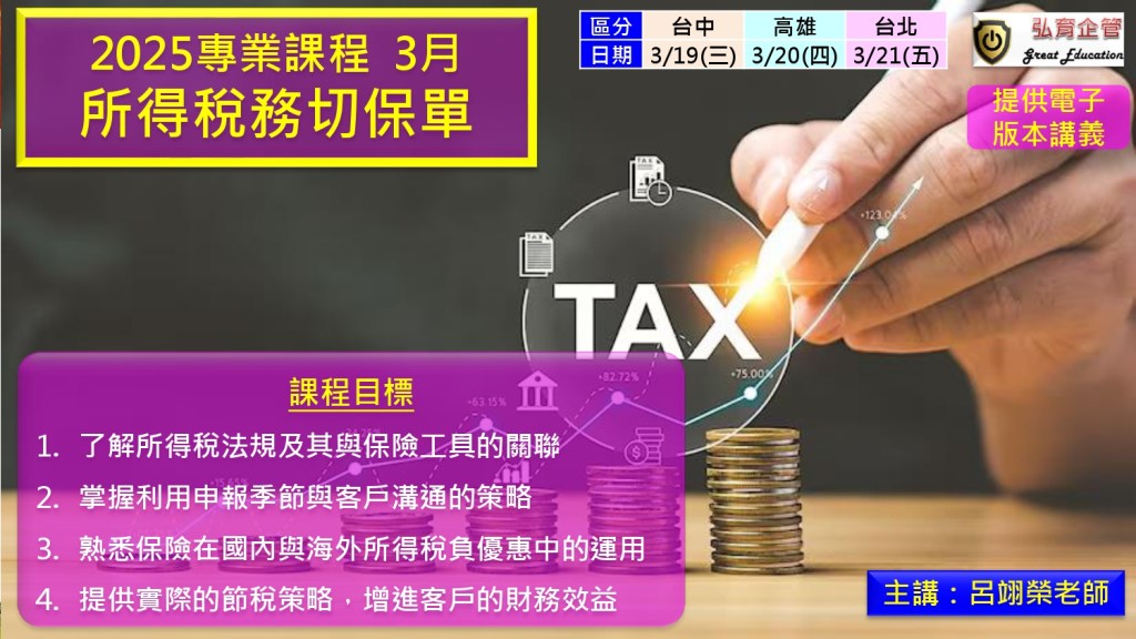 針對如何利用所得稅申報季節,與客戶討論保險工具及節稅功能的三小時課程大綱。目的是幫助業務人員掌握與客戶溝通的切入點,並利用保險在國內及海外所得上的稅負優惠,引導客戶進行有效的財務規劃。