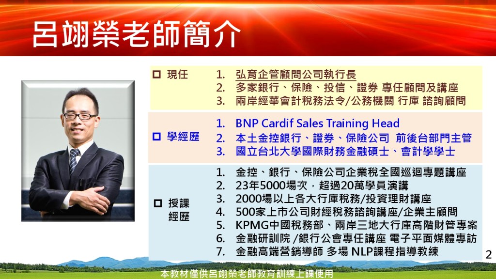 - 案例演練:根據不同客戶的稅務情境,設計相應的保險產品推薦