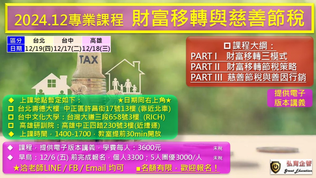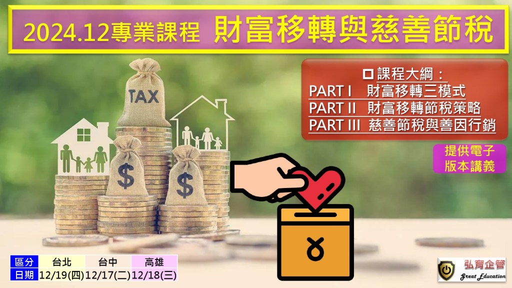 此課程將幫助參與者深入理解如何有效地運用財富移轉及慈善捐贈策略達成節稅目的,並為其家族或個人資產增值保護奠定良好基礎。