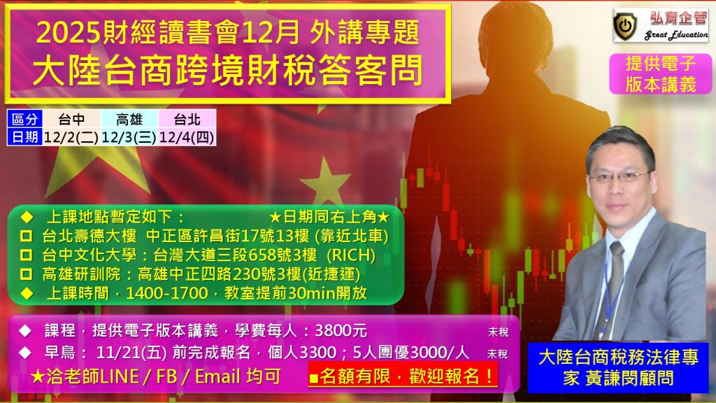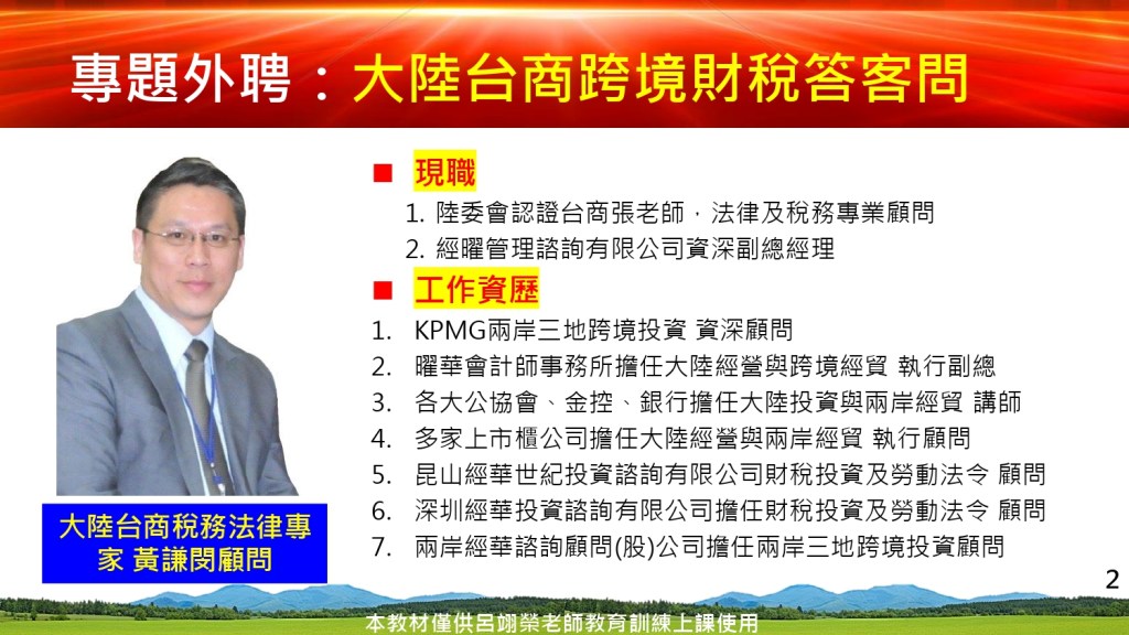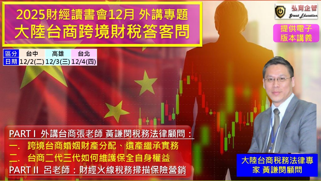 本月份我們請到,多年擔任陸委會台商張老師的黃謙閔顧問,