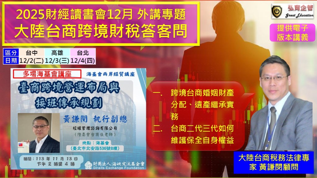 年底時間常是台商返鄉探親的季節,更是富人財富傳承的旺季,